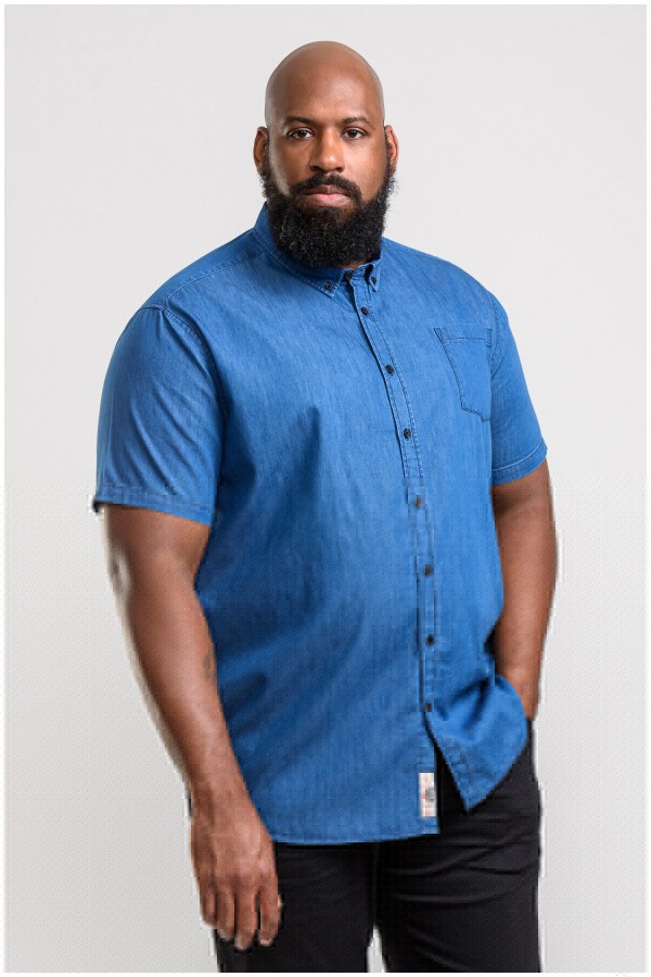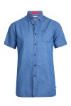 Korte mouw jeansoverhemd van het merk D555 (Arnold KS10618). Dit grote maten vrijetijdsoverhemd is voorzien van een borstzakje en een button-down kraag. Op de linker mouw bevindt zich een kleine badge. Het shirt is gemaakt van 100% katoen.
